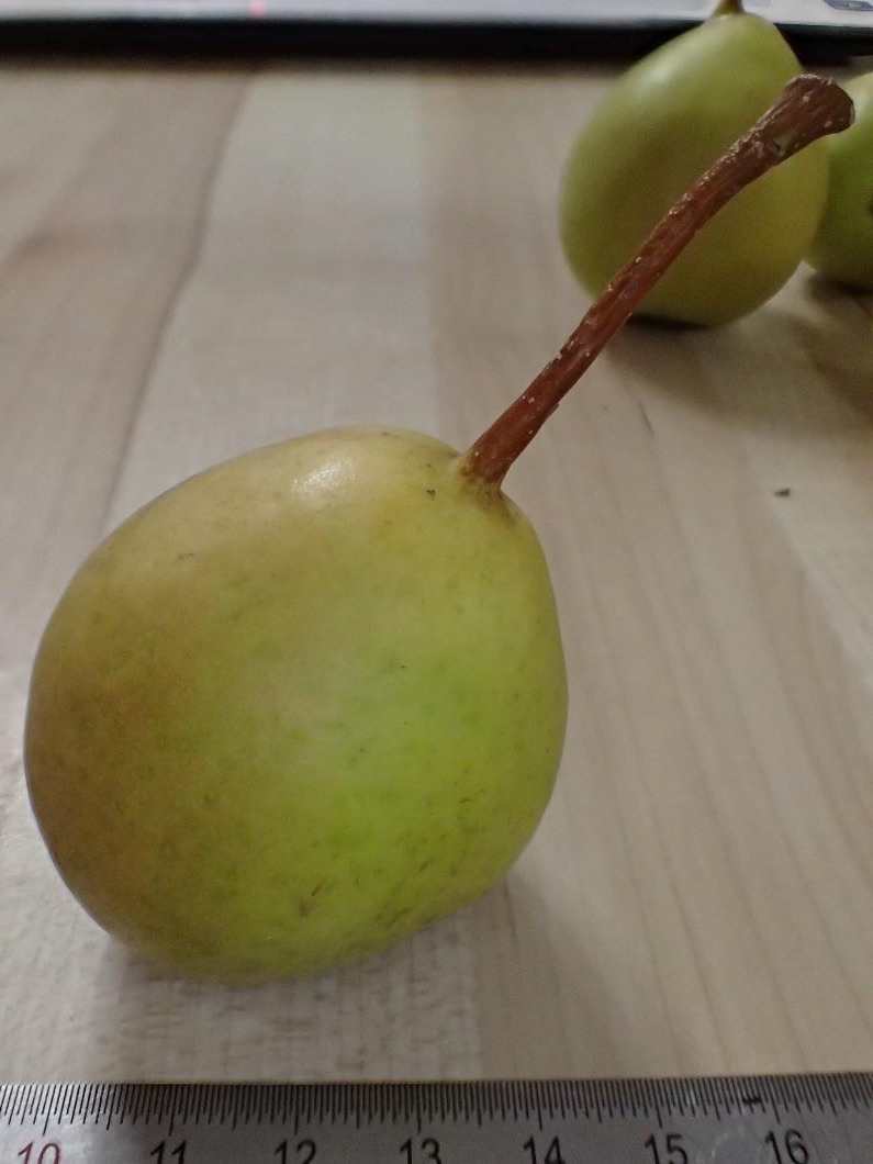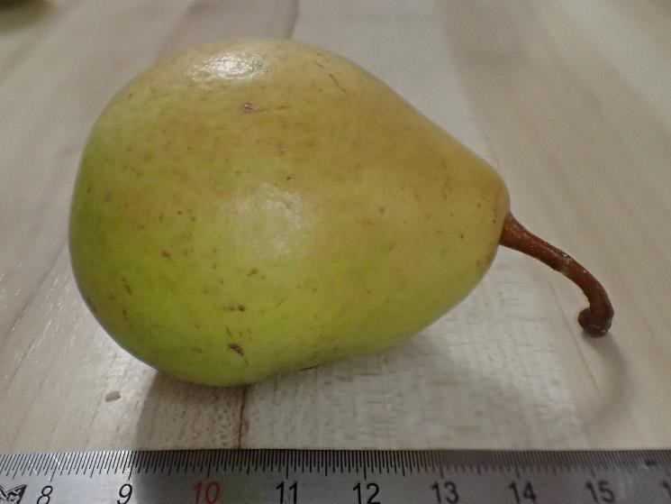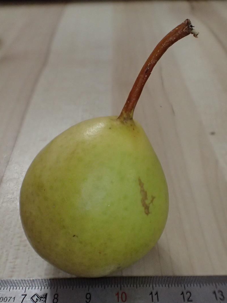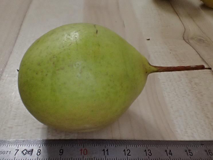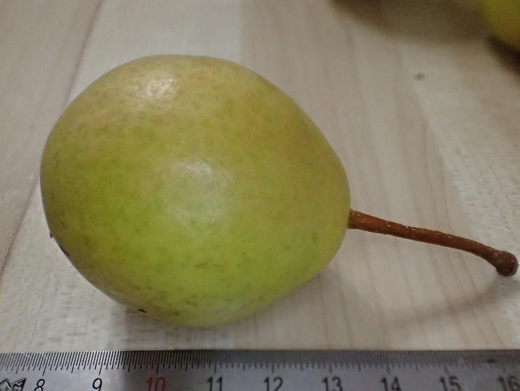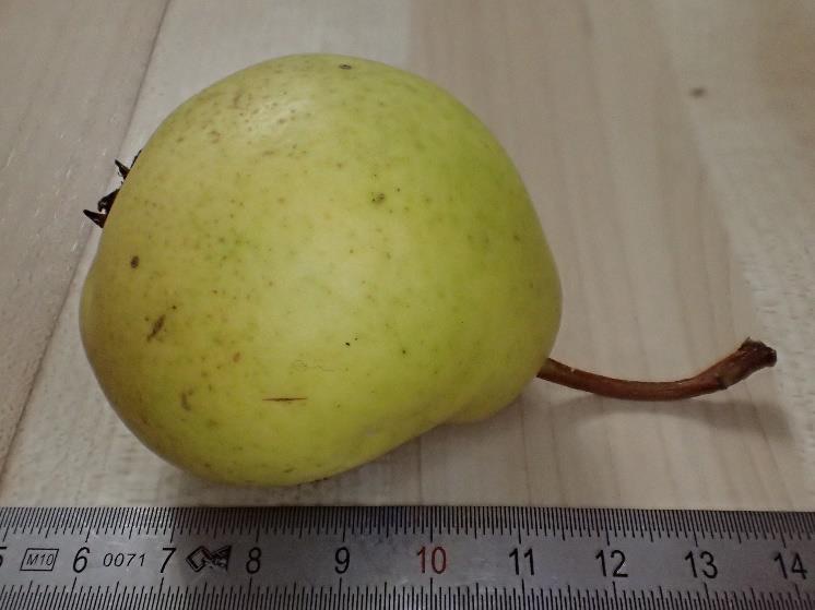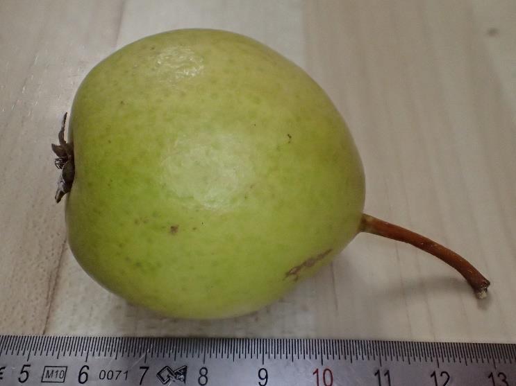 Fruit : pyriforme. Contour régulier. Calibre très petit puisque les fruits mesurés ont pour dimensions (Hauteur x Diamètre) : 58x49mm, 57x48mm, 50x49mm, 50x45mm, 55x49mm, 51x46mm. Leurs masses vont de 50g à 72g (58g, 66g, 72g, 62g, 67g et 50g).