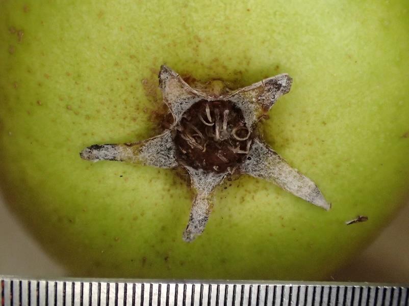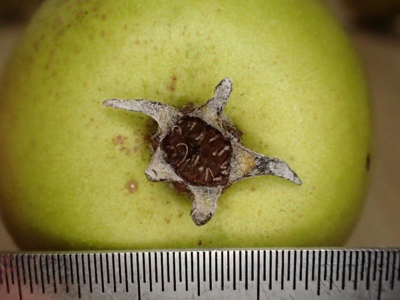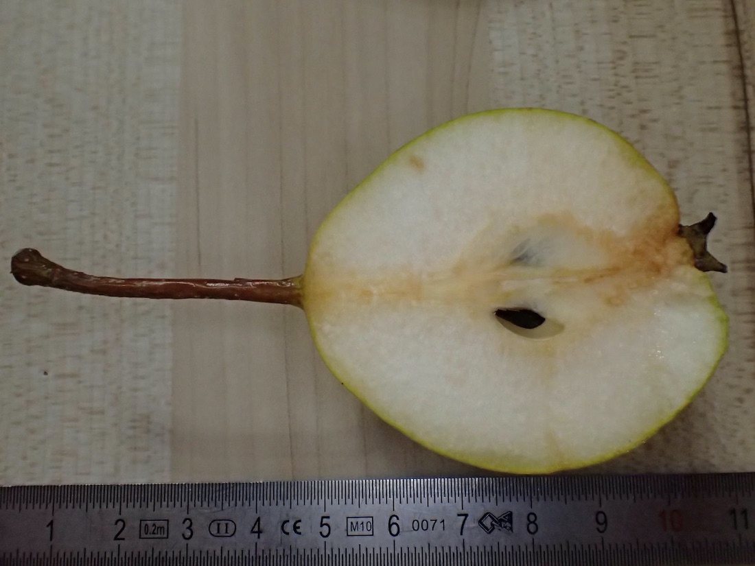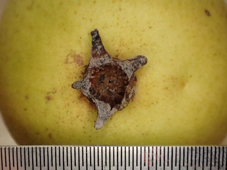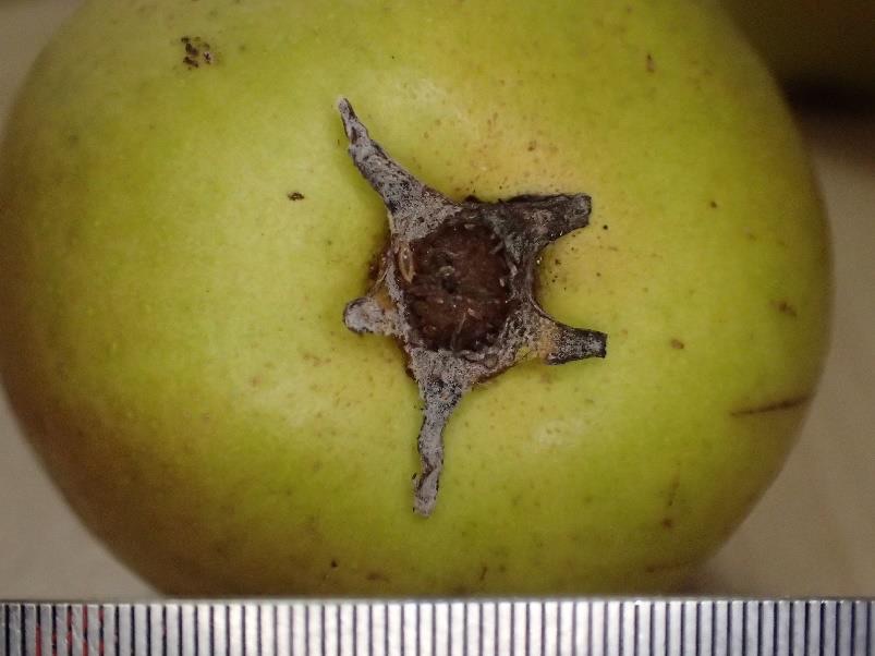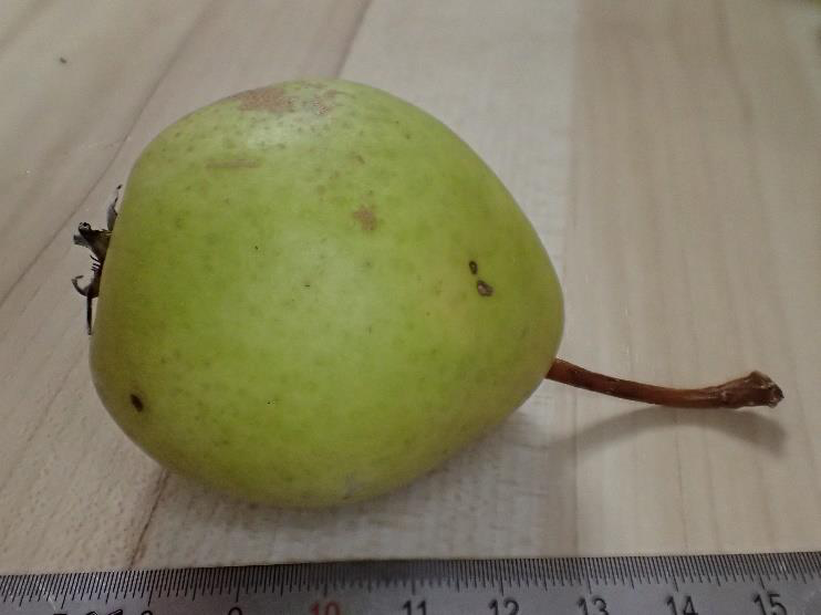 Pédoncule : long à très long. Il a été mesuré sur 5 des 6 fruits (pédoncule incomplet sur un fruit) un pédoncule ayant les dimensions suivantes (Longueur x diamètre) : 36x3mm, 36×2-2,5mm, 35×2-3mm, 32×2-3mm, 36x3mm , pédoncule s’élargissant à (4-)5mm au point d’attache). Il est droit et arqué sur 4 des 6 fruits observés, de couleur brun foncé. La cuvette pédonculaire est inexistante, en pointe, le pédoncule le prolongeant. Présence de gibbosité sur 1 fruit. Gibbosité à peine formée et peu visible sur 2 autres fruits.