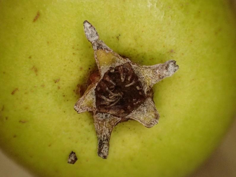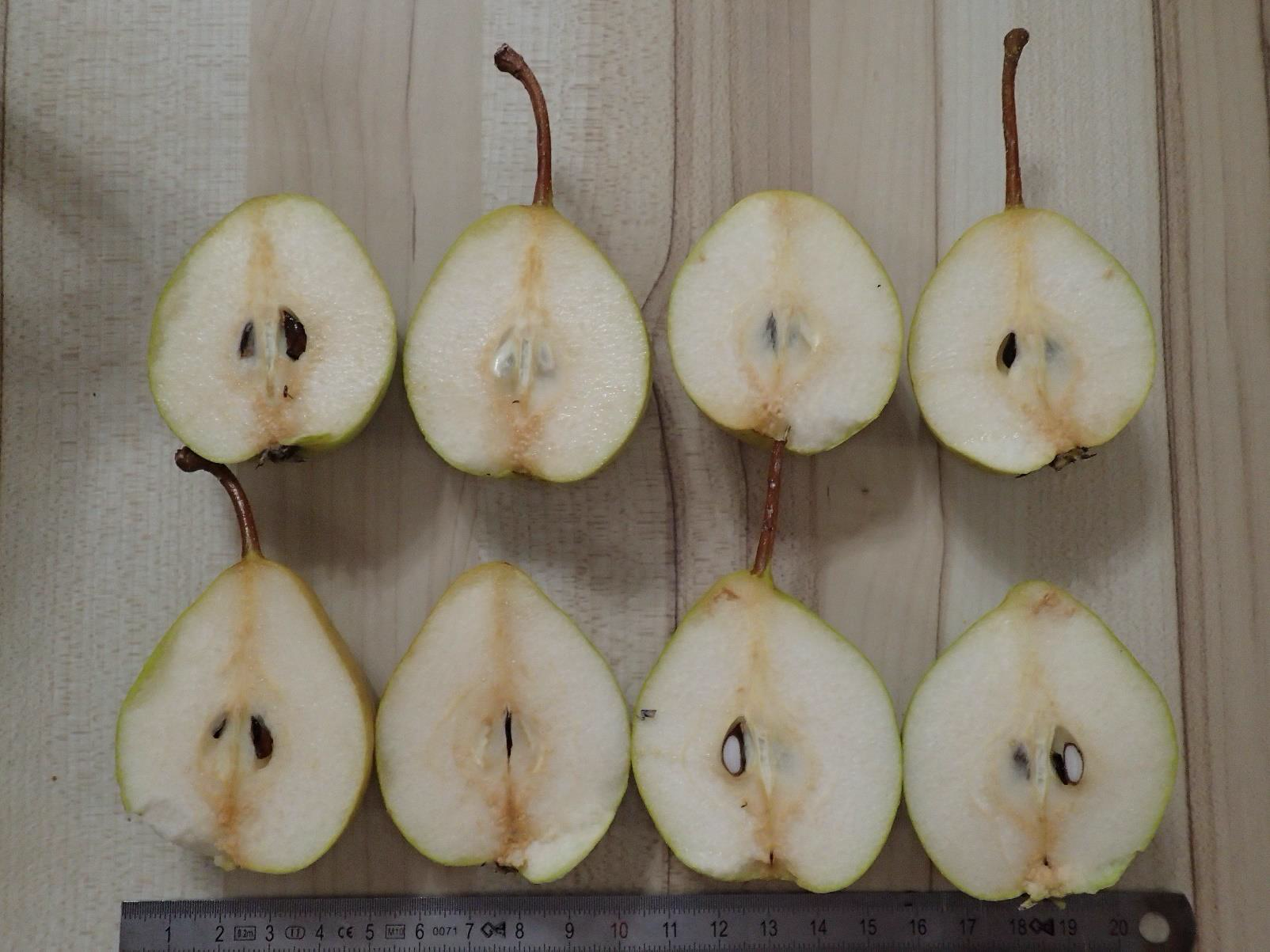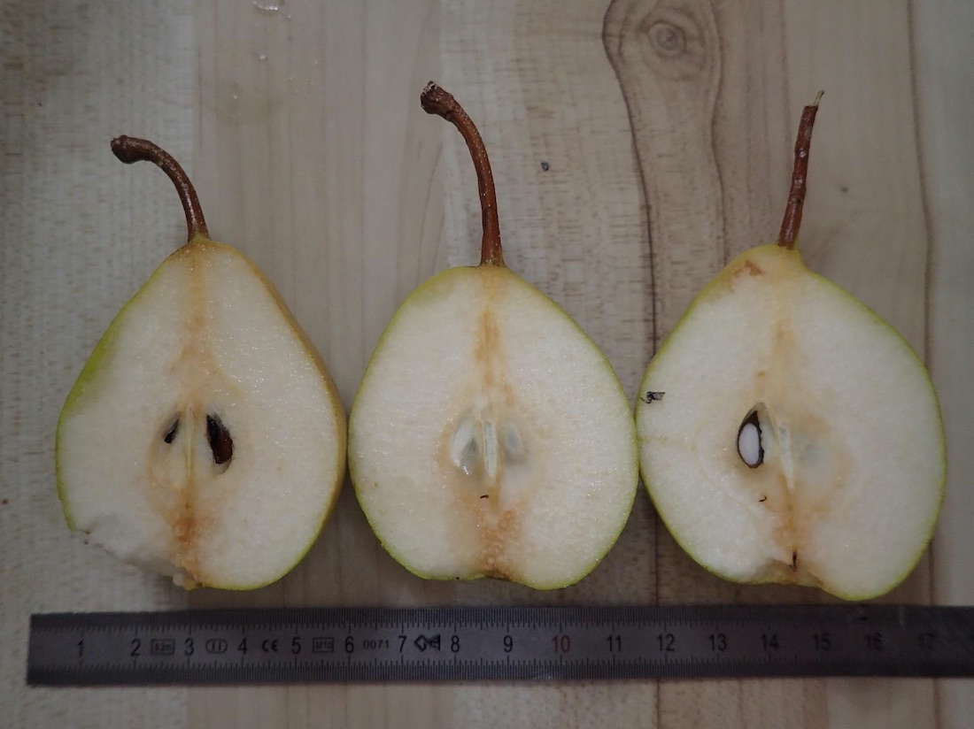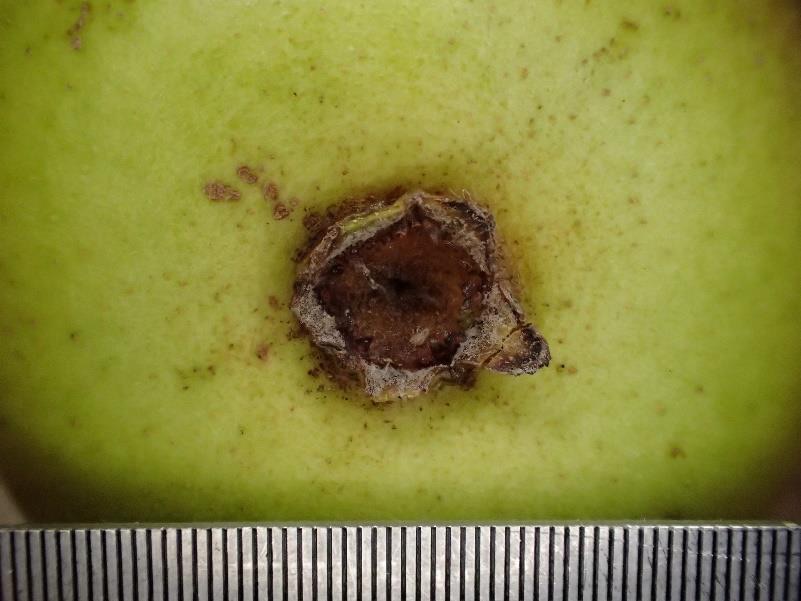 Pédoncule : long à très long. Il a été mesuré sur 5 des 6 fruits (pédoncule incomplet sur un fruit) un pédoncule ayant les dimensions suivantes (Longueur x diamètre) : 36x3mm, 36×2-2,5mm, 35×2-3mm, 32×2-3mm, 36x3mm , pédoncule s’élargissant à (4-)5mm au point d’attache). Il est droit et arqué sur 4 des 6 fruits observés, de couleur brun foncé. La cuvette pédonculaire est inexistante, en pointe, le pédoncule le prolongeant. Présence de gibbosité sur 1 fruit. Gibbosité à peine formée et peu visible sur 2 autres fruits.