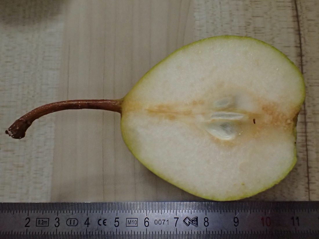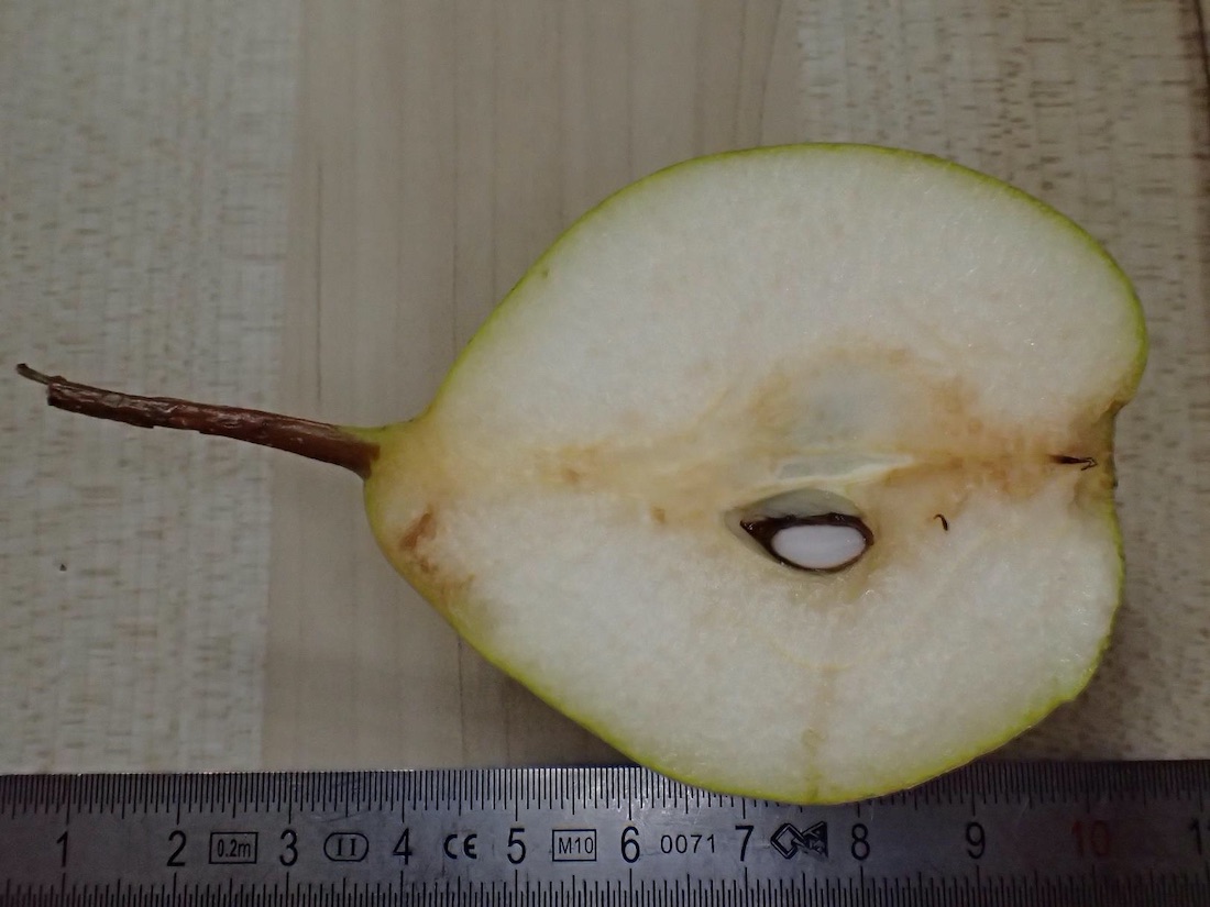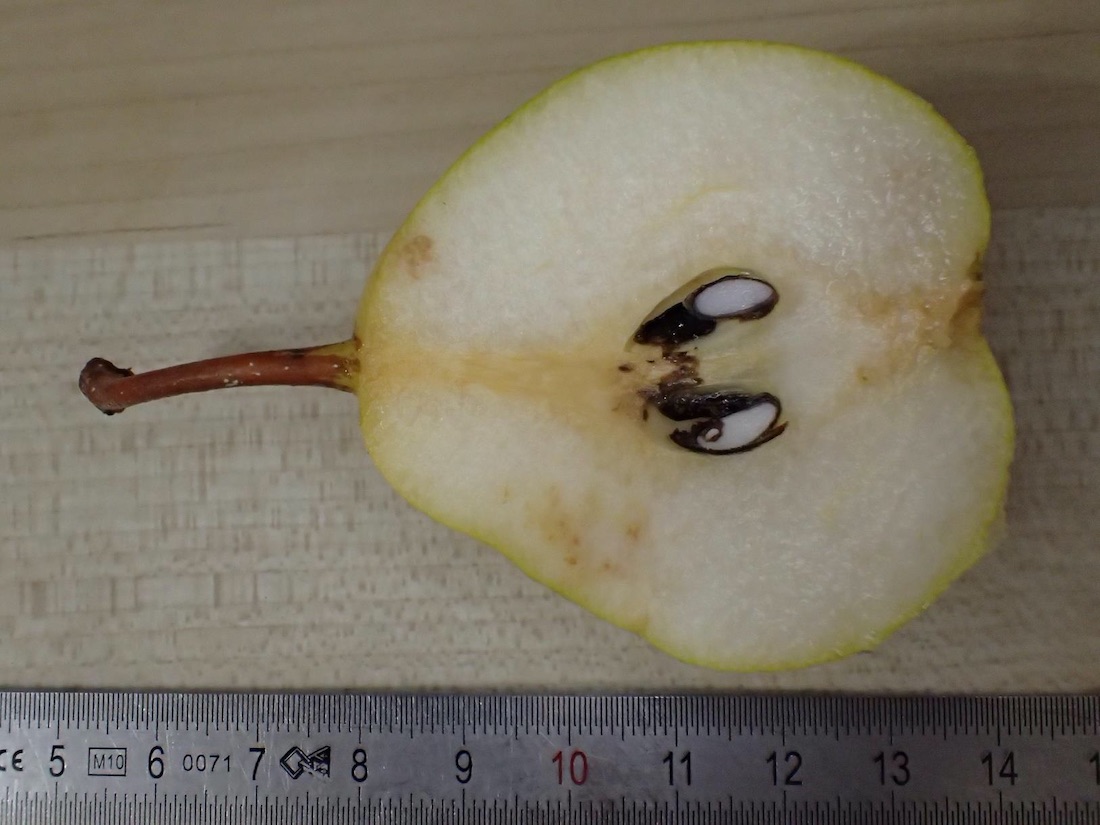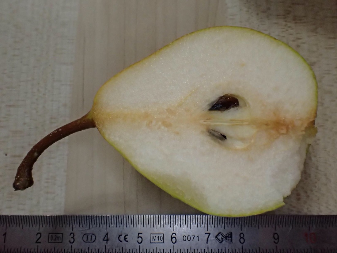 Chair : blanchâtre vite crème, s’oxydant de taches rouille en une dizaine de min., surtout autour du trognon, texture peu juteuse sans granulation, consistance tendre, saveur un peu sucrée, agréable, peau un peu épaisse.