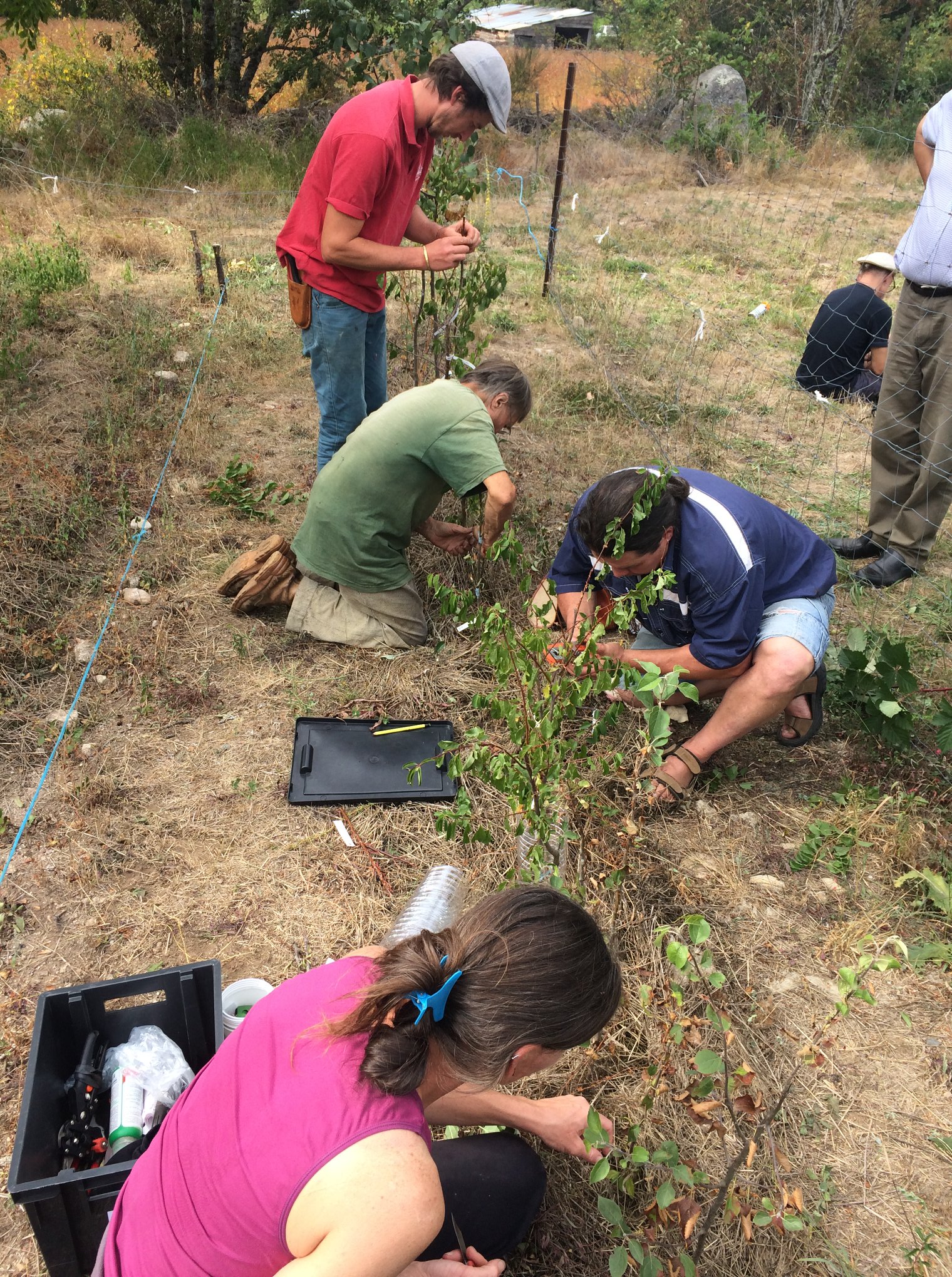 Parfois, des formations sont improvisées en fonction de qui se trouve là, et qui voudrait apprendre, de gré à gré, au gré des saisons. Alexandre, Albert, et Félix, pépiniéristes partenaires de Vergers de Lozère, sont souvent présents et toujours prêts à donner de bons conseils.